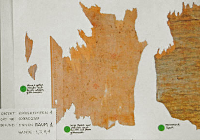 Die gefundenen Tapetenreste werden gesammelt, geglättet und aufgeklebt und dokumentieren