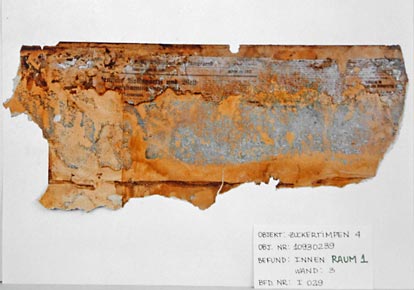 Auf der Rückseite dieses Tapetenrestes wurden Zeitungspartikel aus den 20ger Jahren des 20.Jahrhunderts