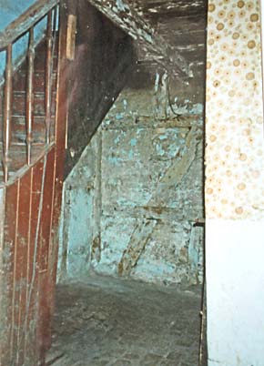 die Treppe aus der Zeit um 1900 ins Obergeschoß; im Hintergrund war ehemals der Küchenkamin mit Bosen.